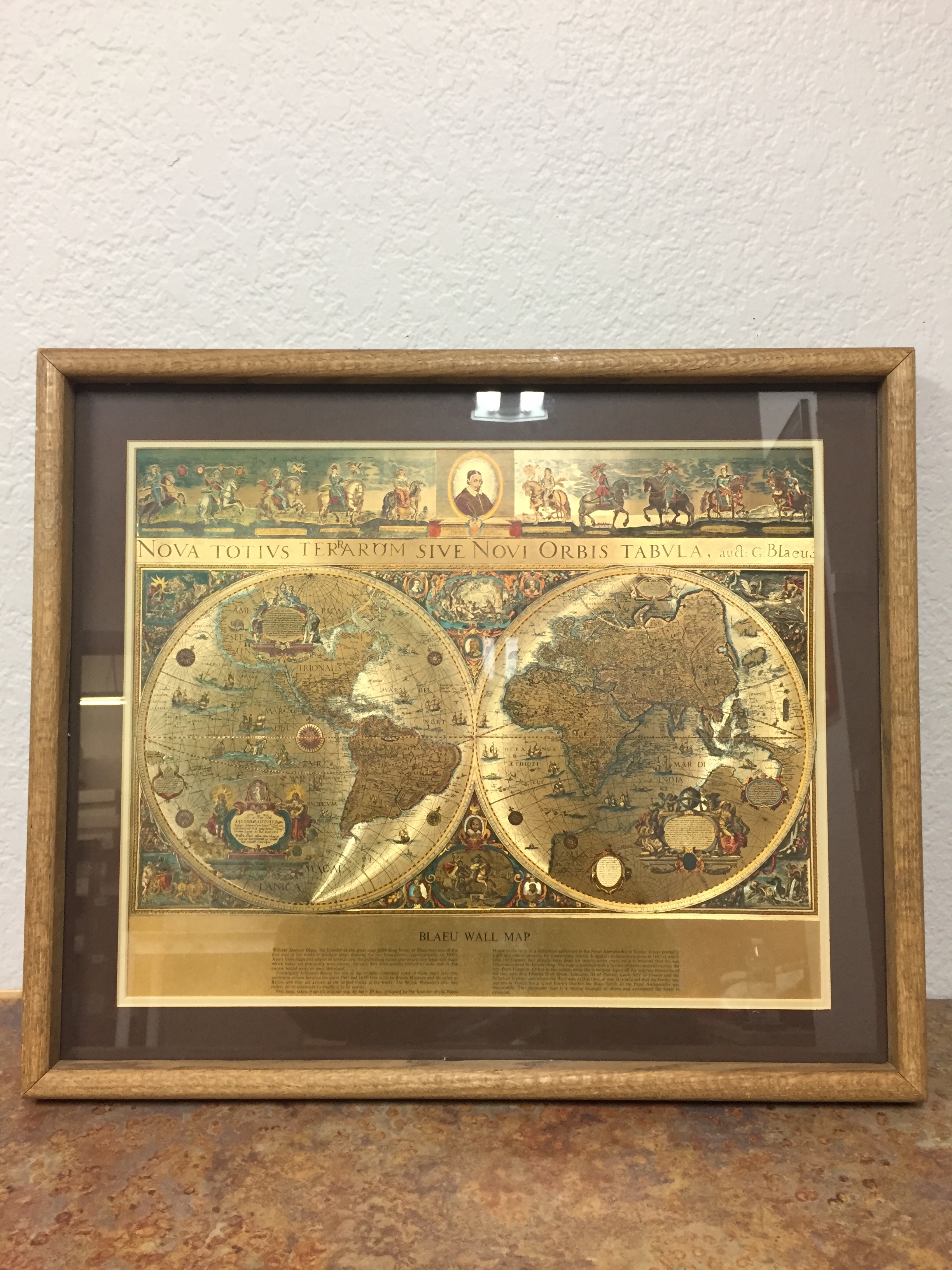 Vintage Framed Gold Foil Blaeu Wall Map Willem Janszoon Wood frame