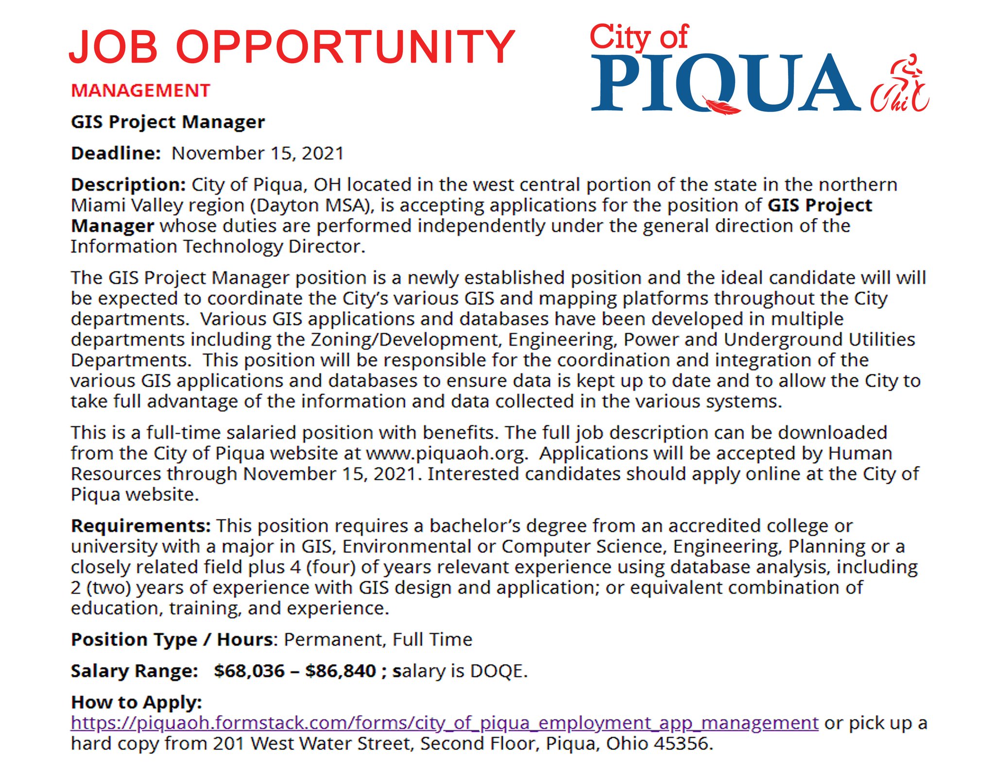 City of Piqua on X: “Job Opportunity MANAGEMENT GIS Project